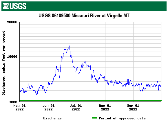 For current water levels check out our current flows page. This gives you the USGS of gauges along the Upper Missouri River Breaks (3 locations). The gauge that we use the most is the Virgelle site.
