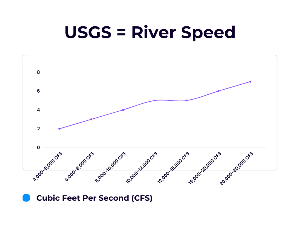 (Please note, when calculating the river speed (not including paddling) add and subtract 1-2 MPH to each speed listed on the graph to get your speed range. The river is not consistent, some sections are quicker than others and vice versa.)